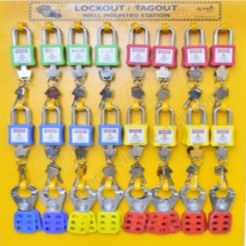 | Material | 32 pcs of OSHA padlock, 16 pcs small lockout hasp, & one 3 mm ACP board with hook. |